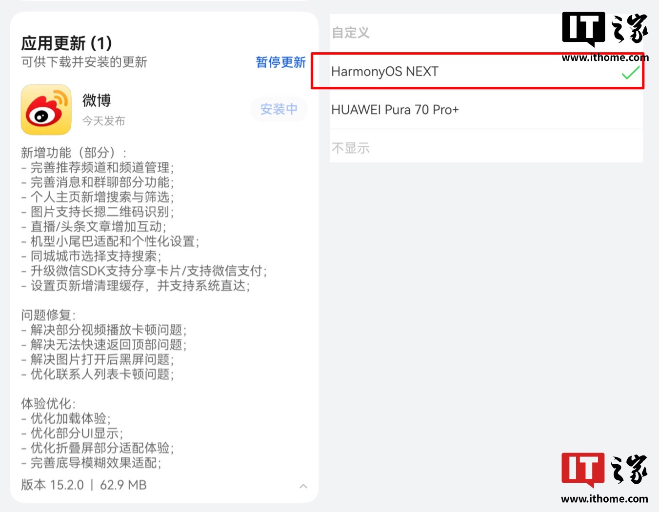 IT之家 3 月 1 日音讯,华为鸿蒙原生版微博今天迎来 15.2.0 版块更新,包体积为 62.9 MB,主要支接济机个性化小尾巴、同期完善保举频谈和频谈治理等骨子。